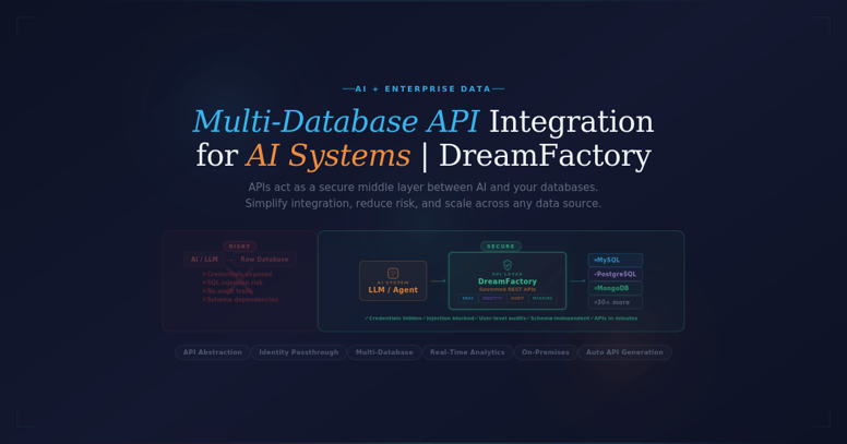 Why APIs beat direct database access for AI. Learn how DreamFactory provides governed multi-database API integration with RBAC, identity passthrough, and audit logging.
