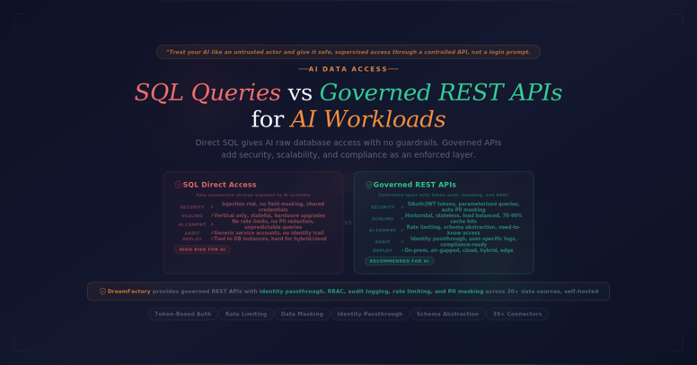 SQL vs governed REST APIs for AI data access. See how DreamFactory provides governed APIs with RBAC, identity passthrough, and audit logging for enterprise AI.