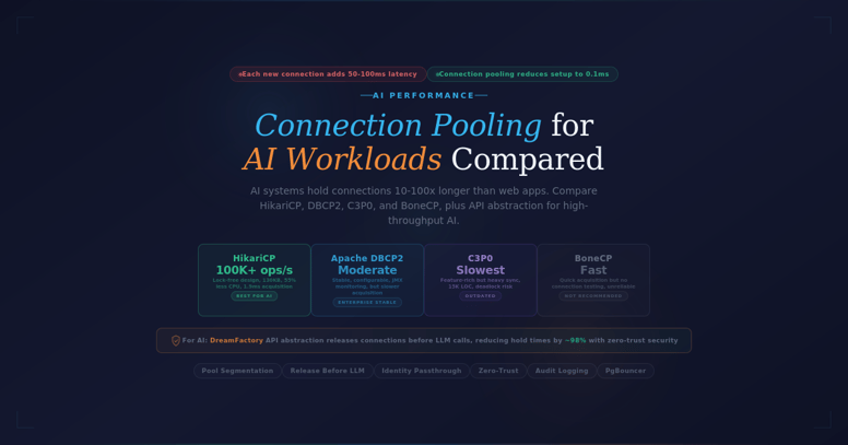 Compare HikariCP, DBCP2, C3P0, and BoneCP for AI workloads. See how DreamFactory provides governed API access that eliminates connection pooling bottlenecks.