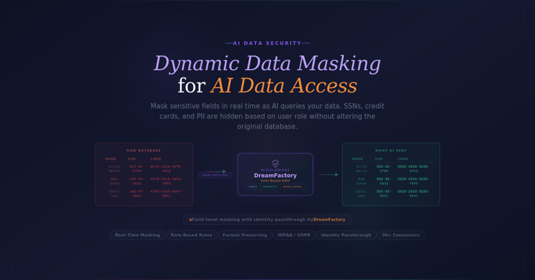 How dynamic data masking protects AI data access in real time. DreamFactory enforces field-level security, identity passthrough, and RBAC for governed enterprise AI.