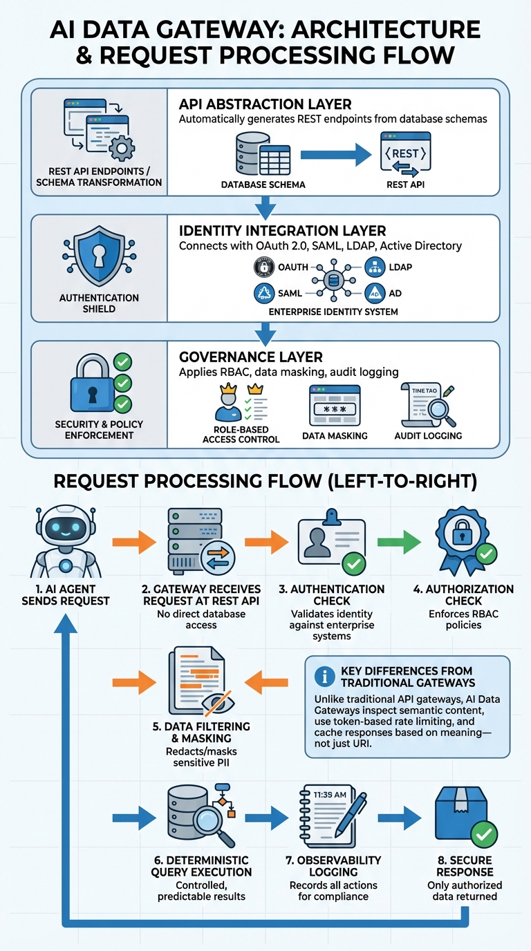 Using standards like the Model Context Protocol (MCP), gateways provide a unified interface that connects AI tools to enterprise systems. AI agents access data through REST endpoints that enforce Role-Based Access Control (RBAC), ensuring secure and authenticated access. Deterministic queries and identity passthrough further enhance security by uniquely verifying each request.